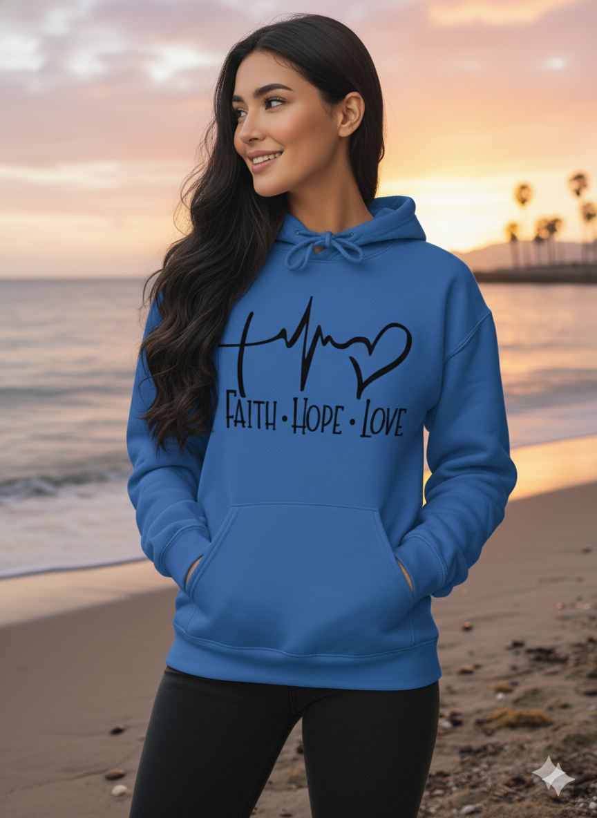 The minimalist design features the Faith · Hope · Love graphic — a visual reminder of 1 Corinthians 13:13 and the foundation of our walk with Christ. The heartbeat line flowing into a heart symbolizes life renewed through faith and the constant rhythm of God’s love.